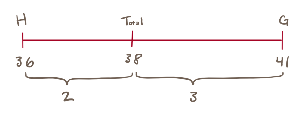 It should be clear that there must be more people in group H than in group G because the average is closer to 36 than it is to 41. To create the ratio of group H to group G you must invert the distances between the individual groups and the overall average to get the ratio of `H/G : 3/2`.