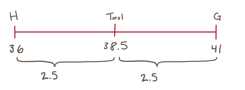 If the average age were 38.5, that would mean there are an equal number of people in groups G and H—because 38.5 is the midpoint between the two averages. This scenario is shown below: